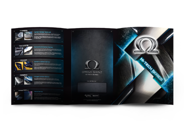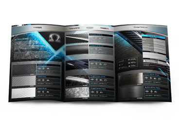 Die Omega-Skinz Hi-Tech Farbkarte präsentiert eine Auswahl von hochexklusiven Verpackungsfolien. Diese Folien verfügen über Spezialeffekte wie Carbon oder gebürsteten Stahl.