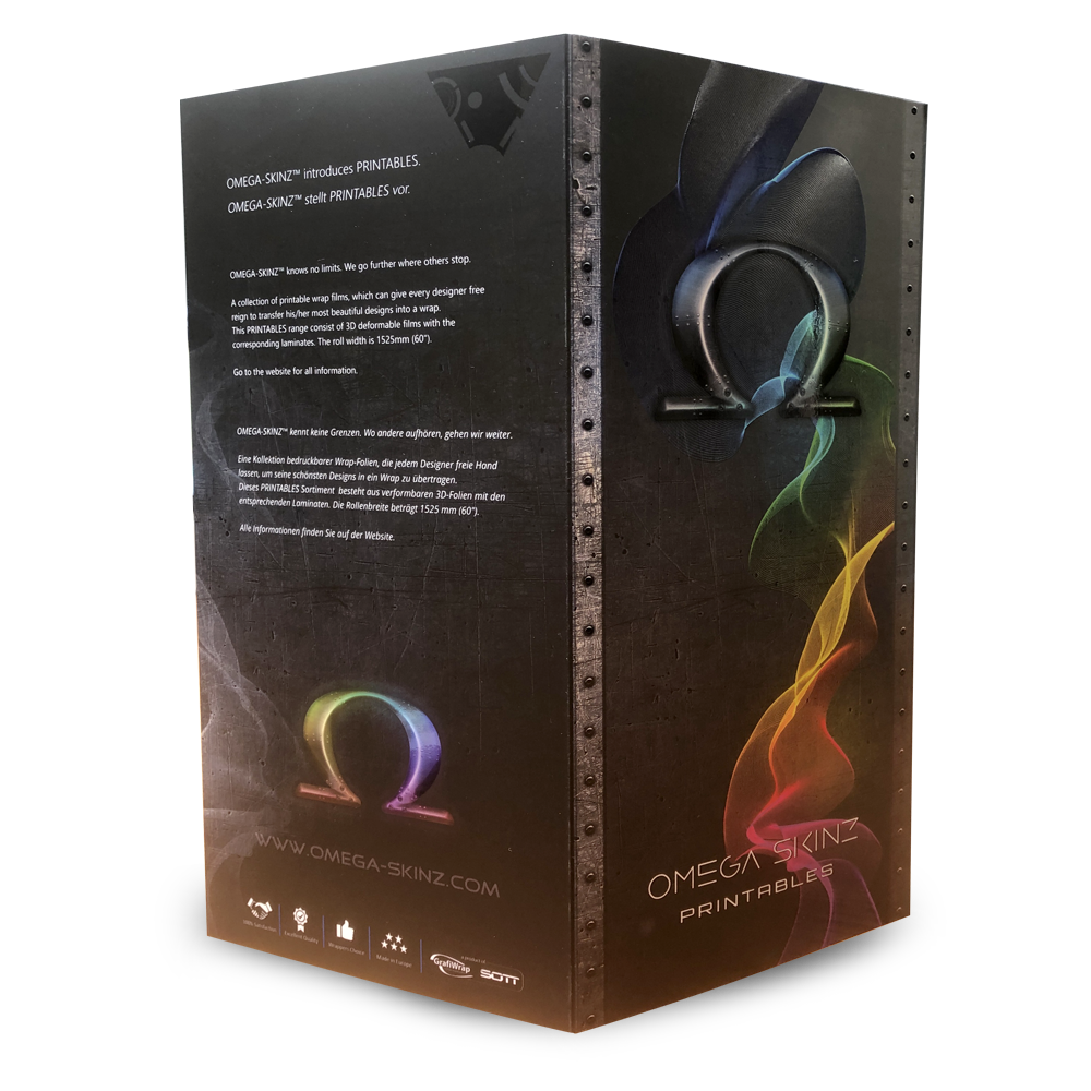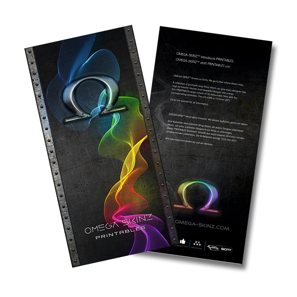 Die Omega-Skinz Printables-Farbkarte zeigt die drei verformbaren druckbaren Folien von Omega-Skinz sowie die vier verfügbaren Laminatvarianten.